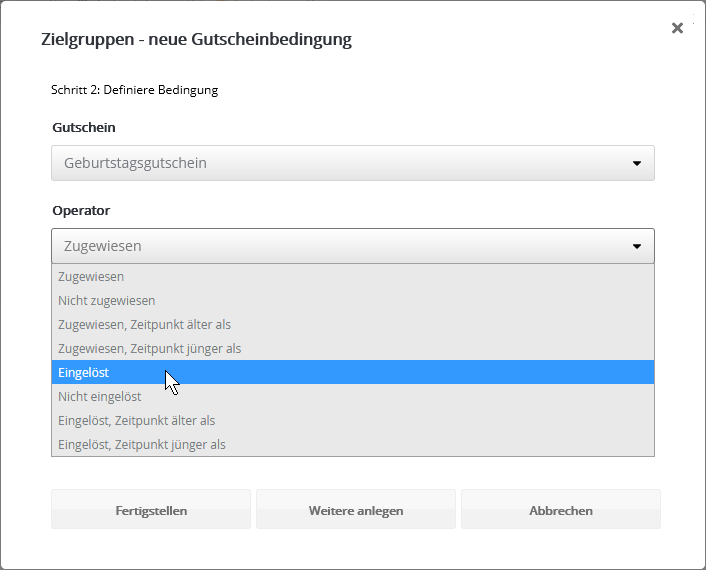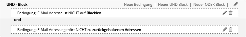 Insbesondere nach dem Kopieren einer vorhandenen Zielgruppe kann das sinnvoll sein, wenn die identischen Abonnenten in Original und Kopie nicht gewünscht sind. Bedingung anhand GutscheinFiltern Sie Abonnenten danach, ob und in welchem Zeitraum die Zuweisung oder Einlösung eines Gutscheins stattfand. Tipp: Um zugewiesene Gutscheine als eingelöst zu markieren, nutzen Sie entweder die Webservice-Funktion 'RedeemVoucherByCode' oder importieren in der Gutscheinübersicht eine CSV-Datei mit den eingelösten Gutscheincodes. Bedingung anhand SelektionMit diesem Bedingungstyp nutzen Sie eine per Webservice angelegte Selektion von Abonnenten als Journeyrocket-Zielgruppe. Der Bedingungstyp ist nur dann sichtbar, wenn per Webservice mindestens eine Selektion angelegt wurde. Das Besondere: In einer Selektion werden Abonnenten anhand einer Liste von IDs gruppiert. So lässt sich eine extern getroffene Abonnentenauswahl als Zielgruppe nutzen, ohne dass in den Journeyrocket-Abonnentendaten ein gemeinsames Merkmal vorliegen muss. Die Details entnehmen Sie bitte der Webservice-Dokumentation, die wir Ihnen gern zusenden. Bedingung anhand des Empfängers (geplant)Diese Bedingung entscheidet, ob ein Abonnent als Empfänger eines bestimmten Mailings vorgesehen war oder nicht. Das bedeutet, dass er in einer Abonnentenliste bzw. Zielgruppe für ein bestimmtes Mailing steht, welches versandt wurde. Im Unterschied zur letztgenannten Bedingung wird der tatsächliche Empfang jedoch nicht geprüft. Es sind auch alle Empfänger enthalten, die das Mailing z. B. aufgrund von Bounces, Blacklists oder serversseitigen Spamfiltern nicht empfangen haben. Bedingung anhand des Empfangens (zugestellt)Diese Bedingung entscheidet, ob jemand ein bestimmtes Mailing empfangen hat oder nicht. Das Mailing gilt als empfangen, wenn der E-Mail-Server des Abonnenten eine positive Rückmeldung erteilt hat. Im Schritt nach dem Empfang ist es dennoch möglich, dass das Mailing beim Empfänger in einem Spamordner landet. Bedingung anhand des BounceverhaltensDamit legen Sie Bedingungen anhand der Zustellungen oder Nichtzustellungen eines bestimmten Mailings an. Bedingung anhand Blacklist bzw. Zurückgehaltener AdressenAbonnenten, deren E-Mail-Adresse auf einer Blacklist oder der Liste der zurückgehaltenen Adressen steht, werden automatisch vom Versand ausgeschlossen. Dieselben* Abonnenten lassen sich per Zielgruppe filtern, etwa um sie beim Export Ihrer Abonnentendaten ebenfalls auszuschließen. Die kombinierte Zielgruppe sieht wie folgt aus: