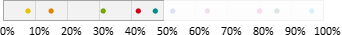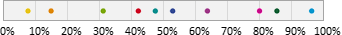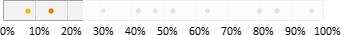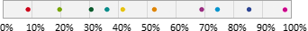 Auswahl-Wahrscheinlichkeit in ProzentGeben Sie einen Prozentwert zwischen 0 und 100% ein. Mit dieser Wahrscheinlichkeit gehört ein Abonnent zur Zielgruppe. Beispielsweise bewirkt ein Wert von 25%, dass ungefähr (siehe Hinweis) ein Viertel aller Abonnenten zur Zielgruppe gehören. Dazu verteilt Journeyrocket alle Abonnenten auf einem Zahlenstrahl zwischen 0 und 100%. Bei 10 "bunten" Abonnenten könnte eine Variante so aussehen: