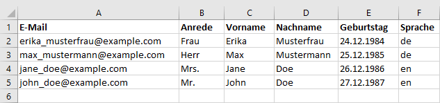 Abonnenten: ImportWahrscheinlich haben Sie bereits eine Liste von Adressen zusammengestellt, die Sie per Newsletter anschreiben möchten. Über das universelle CSV-Dateiformat lassen sich Ihre Adressen aus nahezu jeder Datenbank oder Tabellenkalkulation (z. B. Microsoft Office oder Open Office) exportieren und anschließend in Journeyrocket importieren. Um die Zuordnung der Spalten (z. B. Vorname, Nachname, E-Mail) beim Import zu erleichtern, sollte die erste Zeile Ihrer CSV-Datei aussagekräftige Spaltenüberschriftten enthalten. Ein Beispiel: