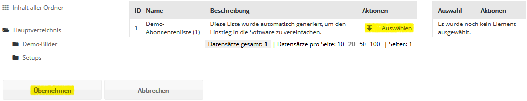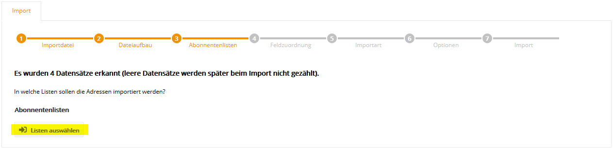 Schritt 3 - AbonnentenlistenWählen Sie nun aus, in welche Journeyrocket Abonnentenliste ihre CSV-Datei importiert werden soll. Falls Sie zuvor keine eigene Abonnentenliste in Journeyrocket angelegt haben (siehe Menü Abonnentenlisten), steht zum schnellen Einstieg die leere Abonnentenliste 'Demo-Liste' bereit. Diese Liste wird in der Regel bei der Einrichtung Ihres Journeyrocket Kontos angelegt und zur Demonstration mit einem Beispiel-Abonnenten befüllt.