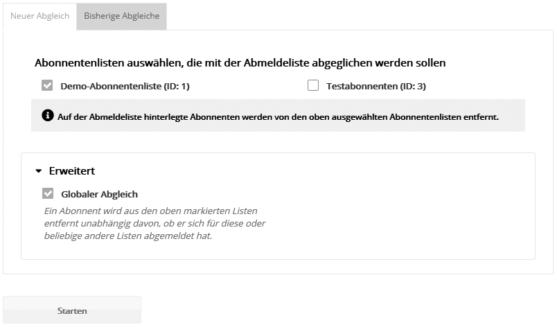 Mit der Schaltfläche 'Starten' kann der Abgleich durchgeführt werden. Nach Klick auf 'Ja' bestätigen Sie die Meldung, dass Datensätze abgemeldeter Abonnenten automatisch gelöscht werden können.