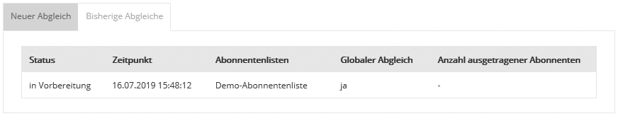 Daraufhin startet Journeyrocket den Abgleich. Im Reiter 'bisherige Abgleiche' können Sie den Status des Fortschrittes einsehen. Nach Fertigstellung wird Ihnen die Anzahl der ausgetragenen Abonnenten angezeigt. |
