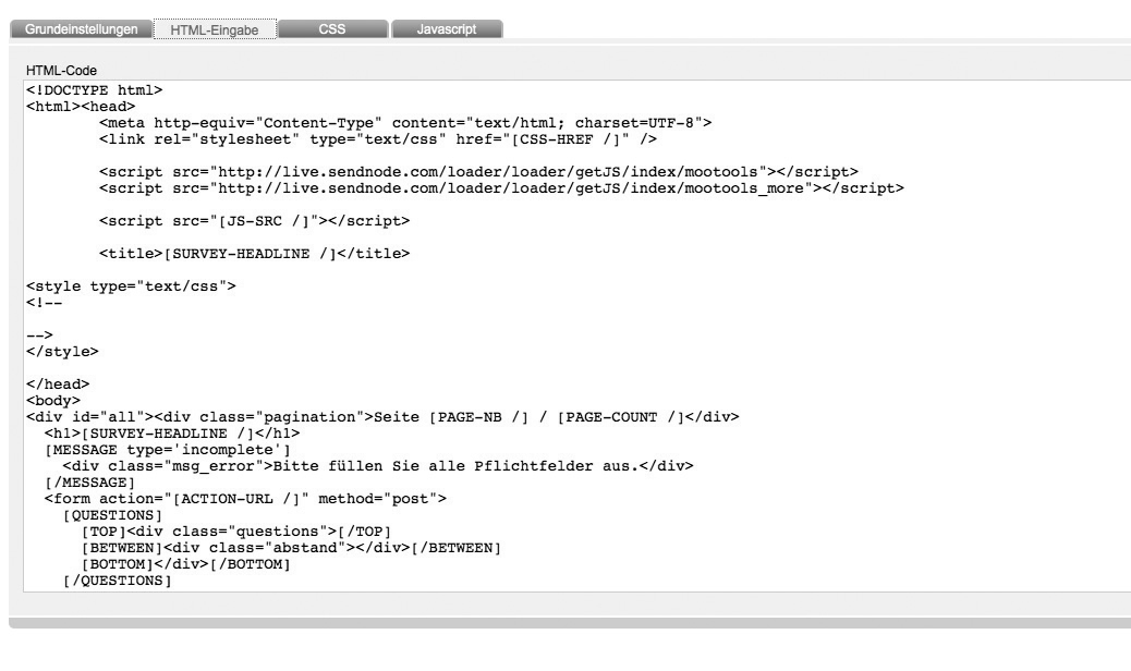 Insert your entire html source code. By creating a new template, Journeyrocket generates a sample html source code with all important survey-placeholders automatically in this tab.