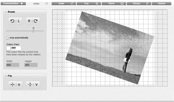 Rotate: This tab includes functions to rotate or reflect your image. The two buttons in the top rotate the image 90 degrees in each case either the right or left. Decide if your image should be cutted automatically or if a framework should be created, which can be colored.