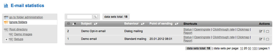 Additionally to the point of sending you find the shortcuts 'status', 'openingrate', 'Clickthroughrate' and 'Report'. More information about these points you will find below. Furthermore the functions 'open' and 'open file' are available. While you can access on the dataset over the button 'open', you can switch to every file if you click on 'open file'.