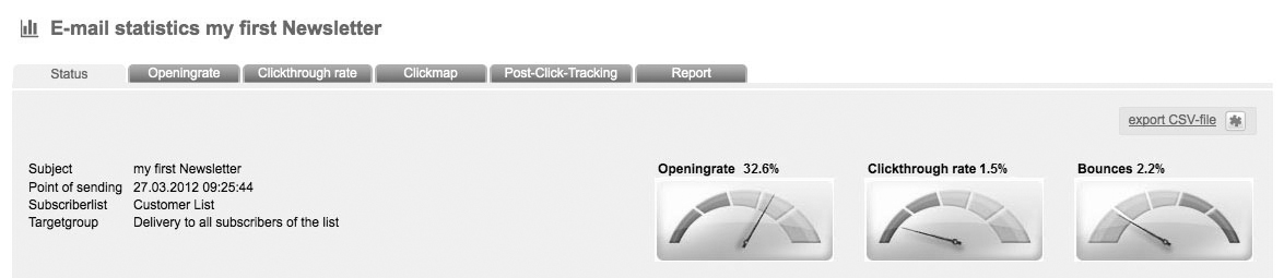 Here you get a quick overview of the most important figures of your sent newsletters.In addition to the details of your sent mail, you see the openingrate, clickthroughrate and bounces in the form of barometers. Under 'status' you can export the statistics as csv-file. The summary, open- and clicktroughrate are cleary displayed.