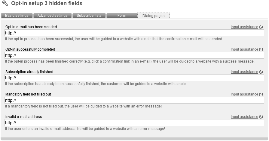 Now enter a name and an optional description for your optin setup. Then choose the 'mode' (important). The following modes are supported by 'Journeyrocket': Double Opt-in with confirmation e-mail (recommended as the only legally secure login variant): Interested party visits a website with an optin setup form. He enters his data into the form. He gots an e-mail with content like this: „Thank you for your optin. Please confirm the registration confirmation link to complete your registration.“ He clicks the link. Registration is completed. He gots a „welcoming“ e-mail. You can integrate information about your company and a certain design as well. Double Opt-in: Like described before, but without sending of a „welcoming“ e-mail. Confirmed Opt-In: Nach Anmeldung auf der Webseite wird sofort eine automatische Begrüßungsnachricht versendet. Single Opt-in: No e-mails will be send. There just will be a message in your browser, that registration was successfull. According to the mode you've choosed, you have to adapt different sub-options. In Tab 'advanced settings' you can deposit your e-mail address in field 'e-mail forwarding', to be informed about new subscribers. In field 'mailing for later delivery' you can determine your last sended newsletter. All new subscribers will receive your last mailing and don't have to wait for another one. To protect your optin-form against abuse, activate the invisible captcha . Captchas are often used to check if petitions are produced by a machine (robot, short: bot) or a real person. Bots are often used abusive to generate masses of subscriptions. Choose your favorite subscriberfields, which should be filled in in next tab 'Form'. After clicking 'Add subscriberfield' a pop up appears, where you can select and add subscriberfields to your optin-form. Furthermore you can add one or more subscriberlists as option(s) in a ceckbox through the button 'add subscriberlist'. Click 'sort formfields' to edit order of your fields. Click 'test form' to check your form by a preview of your optin-form. Next tab: 'Dialog pages':