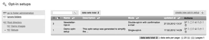 Through 'Setups' and 'Optin Setup' you can create forms, which can be included into your website. So interested parties can login automatically on your website for your subscriberlist(s). Please note: Requirement for a successfull 'optin setup' is to create an e-mail with type 'dialog mailing' for registration confirmation and welcoming, which got the status 'activated'. Otherwise those mailings will be lacking in the shortlist of mailings which you can choose for your optin setup. For an esier start Journeyrocket gots a „Demo optin setup“ for you. Created optin setups can be 'opend' afterwards for editing, 'moving' to another folder or 'deleting'. If you have moved an optin setup into another folder, click 'open folder' to get into. Create new Optin setup |