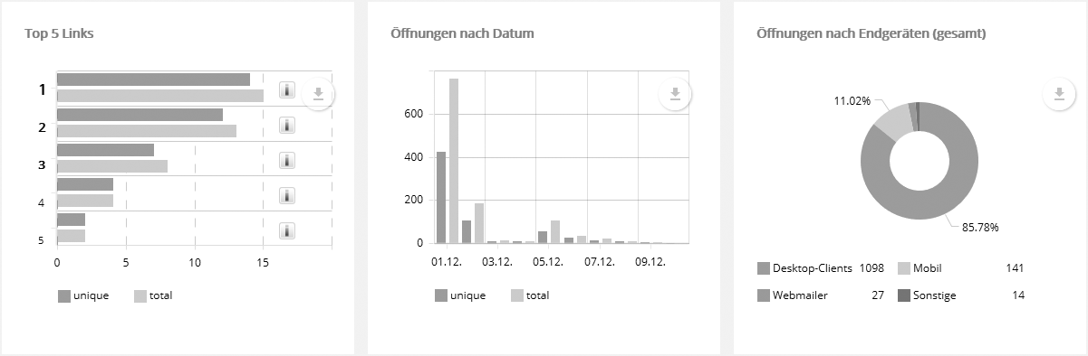 E-Mail: Übersicht, Öffnungs-/KlickrateReiter 'Übersicht'Die Übersicht fasst die wichtigsten Kennzahlen und Empfänger-Reaktionen Ihres Mailings zusammen. Oben rechts finden Sie zwei Schnelllinks: