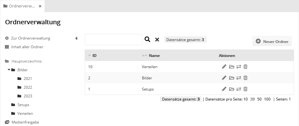 Administration: OrdnerverwaltungNutzen Sie unsere Ordnerverwaltung, um Ihre Mailings, Bilder, Zielgruppen usw. in Ordnern zu organisieren. Sie können beliebige Ordner und Unterordner anlegen, etwa für bestimmte Themen, Abteilungen oder Zeiträume. Auf der linken Seite können Sie einen Ordner wählen. Auf der rechten Seite werden die darin enthaltenen Unterordner angezeigt. Diese lassen sich über die Symbole in der Aktionen-Spalte bearbeiten, öffnen, verschieben oder löschen.